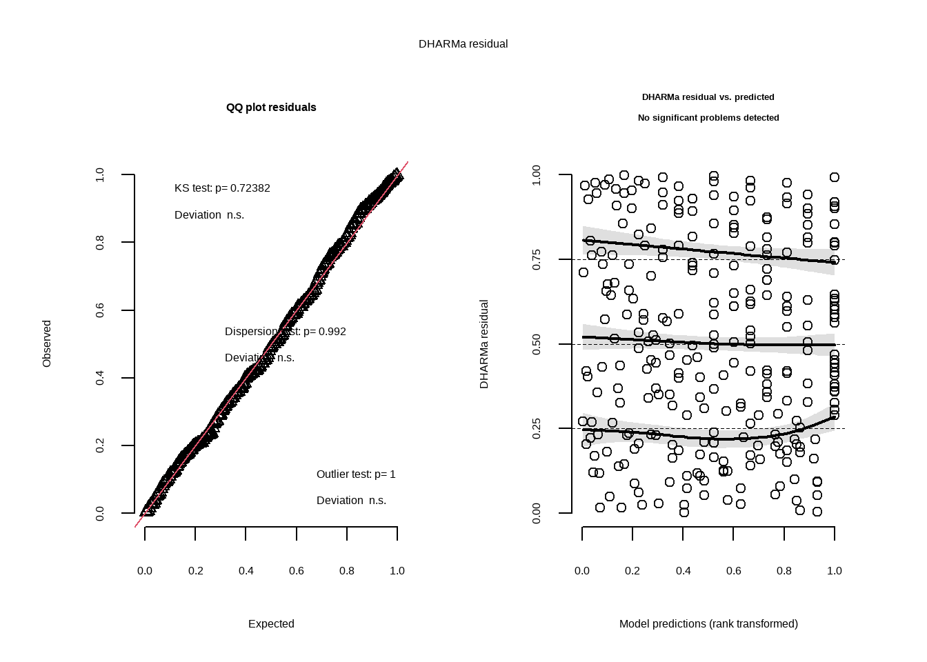 plot(simulateResiduals(model2)) # plot residuals using function from DHARMa for model2