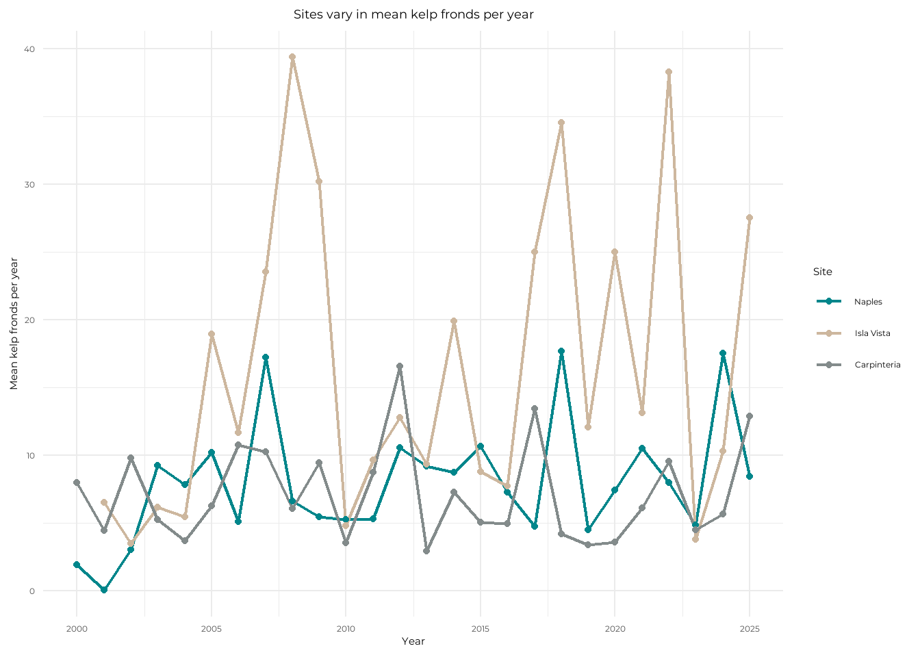 title = "Sites vary in mean kelp fronds per year", # add plot title