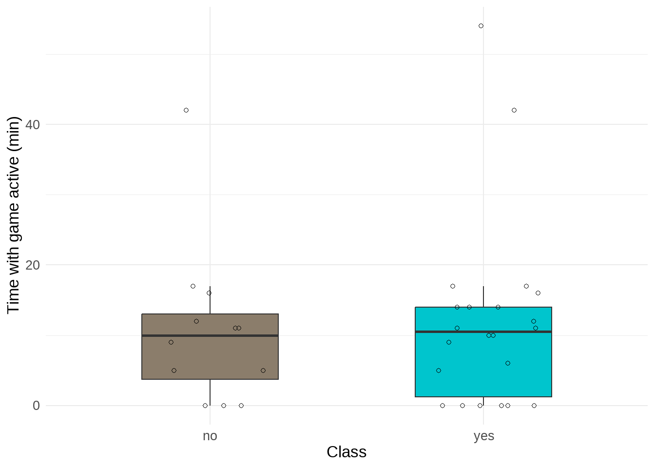 Figure 4. Time with game active (min). Individual points represent observations of tracked game screen time on a day with or without class. Boxes represent interquartile range and the center line of boxes represent median value. Line connected to boxes represents outer quartiles of data.