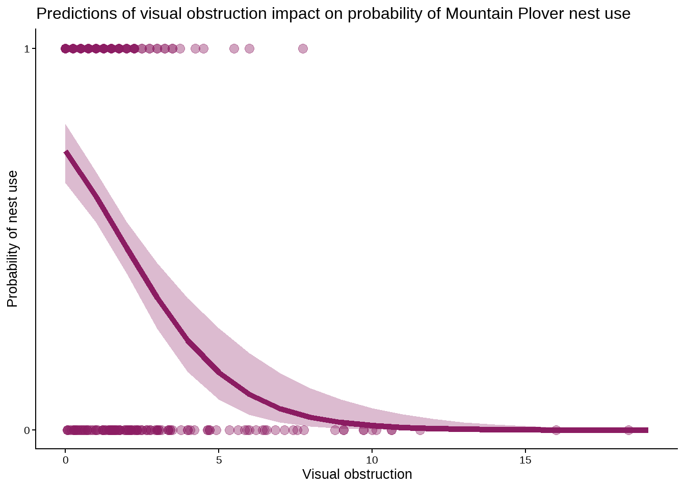 title = "Predictions of visual obstruction impact on probability of Mountain Plover nest use") # set title